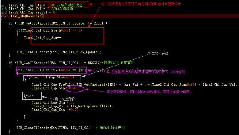 计算出频率。其中有一些小技巧,在对Time2_Ch1_Cap_Sta状态值清除的时候只清除0x80和0x20,是为了实现只有在两个上升沿之间进行更新记录(图5)。