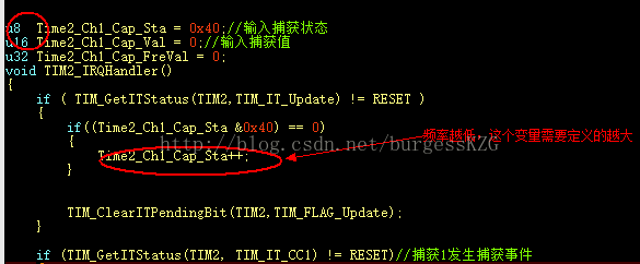 2、捕获的频率范围是否受限制,答案是不一定。以本实验为例,arr= 899,psc= 3;那么很明显,该实验中定时器的时钟频率是18M,所以当所测信号频率太高,在一个计数值跳变之间发生了两次上升沿,这种是测不出来的,或者测出来也是不准确的,也就是说当所测的信号频率越接近该定时器的时钟频率,误差值就越大,在实测的时候600K的频率就有点问题了(也可能是操作问题,该数据没有太大参考价值)。那么反过来,当所测频率很低,那测试结果怎么样,这个时候大家只要保证记录定时器更新的变量不要溢出,在计算过程中所有相关变量不要因为其他值的影响而不准确就不会有太大误差,在本例程中Time2_Ch1_Cap_Val定义为u8类型,可用的就低5位,最大值也就是31,计算可以知道能测的最低频率645.16多,所以如果要再低,就设置该变量为u16类型,把特殊比特位左移就行了(图6)。