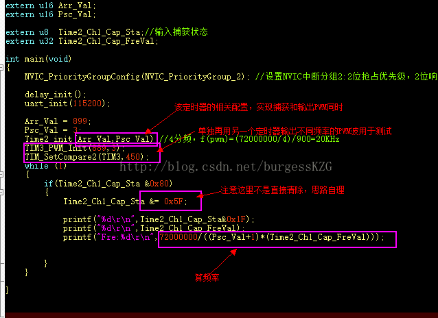 6、主函数中轮询判断是不是已经检测完成一次测试了,如果是,那清除掉相关屏蔽,然后利用"72000000/((Psc_Val+1)*(Time2_Ch1_Cap_FreVal))"