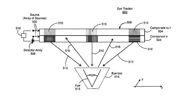 一种用于确定眼睛位置的眼动追踪器,可集成到头显之中。眼动追踪器包括至少一个含有光栅结构阵列的波导,一个光源阵列,一个检测器,以及一个控制器。 控制器一次激活至少一个光源以发射至少一个光束,而光束从至少一个波导中进行传播并经由光栅结构阵列朝向用户眼睛耦合输出。从用户眼睛和皮肤表面反射的光信号耦合到至少一个波导,并传播到用于捕捉光信号的检测器。控制器计算反射光信号大小以获得转换光信号的特征,并基于转换光信号的特征确定用户眼睛的位置与方向。
