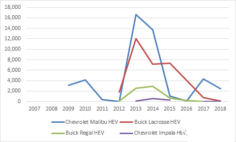 在下面的数据里面,值得注意的是凯迪拉克ELR和CT6两款PHEV的失败,我觉得还是很有代表性的。从这款车上面,我们看到一个品牌特性和技术特性背离,凯迪拉克在美国的客户群体,对于插电这个技术的契合度真的不高,用PHEV的特点去引导客户整个销量只能用惨淡来形容。技术如果失去了推动品牌的溢价,只能在雪佛兰上当白菜价来卖,围绕动力总成的成本增加无法在整车层面抵消,我觉得这个是整个HEV/PHEV推动比较失败的主要原因。