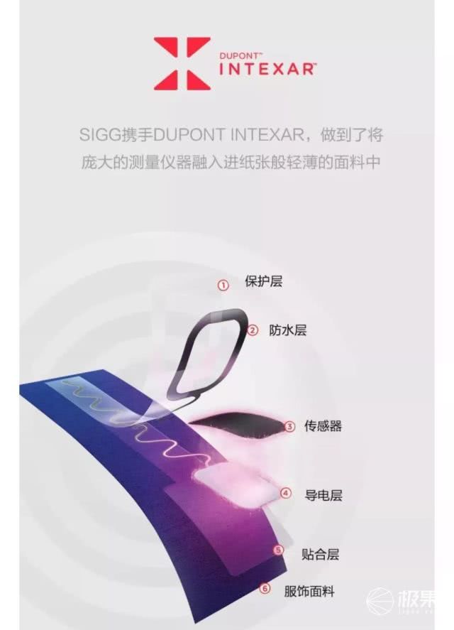 对智能面料的官方介绍:运用了杜邦 Intexar科技——可将普通布料转化为主动的、连线的、智能型的服饰,提供关键的生物技术测量数据,包括心率、呼吸速率、形体感知和肌肉紧张度。