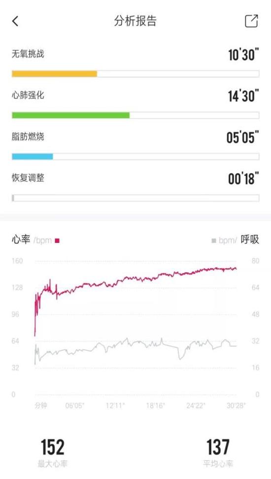 整个训练从热身开始,每隔6分钟,跑步机的时速升高1km,整个时长30分钟,完整的心率曲线如下图。