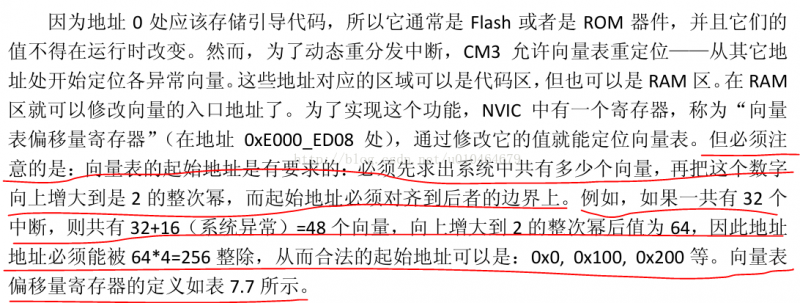 至此最初的疑问已经解决,但是在读上面划红线的文字时,一个疑问在我脑海环绕:为什么要一定为2的整数次幂,按着划红线的示例,我在flash中就花费48*4个字节给中断向量表不就挺好么。对于这个问题目前还没有发现比较好的答案,根据我个人的理解,我觉得可能是出于以下两点原因: