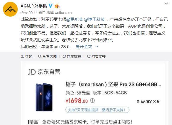 “诚挚道歉!对不起罗老师@罗永浩 @锤子科技 ,本来想在寒冬开个玩笑,但自己幽默细胞太差,过了。大家提醒后,我们反思了这个错误,AGM也是创业公司,深知创业不易。但愿我们一起扛过寒冬,寒冬终会过去,我们也相信,理想主义最终会战胜现实主义。老板说去北京下次当面赔罪。