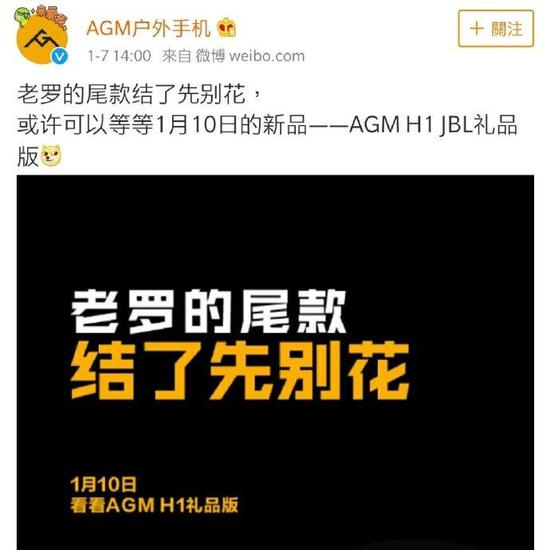 1月7日,AGM户外手机官方微博发表名为“老罗的尾款结了先别花”的海报,宣传自家将于1月10日发布的新品AGM H1 JBL礼品版。