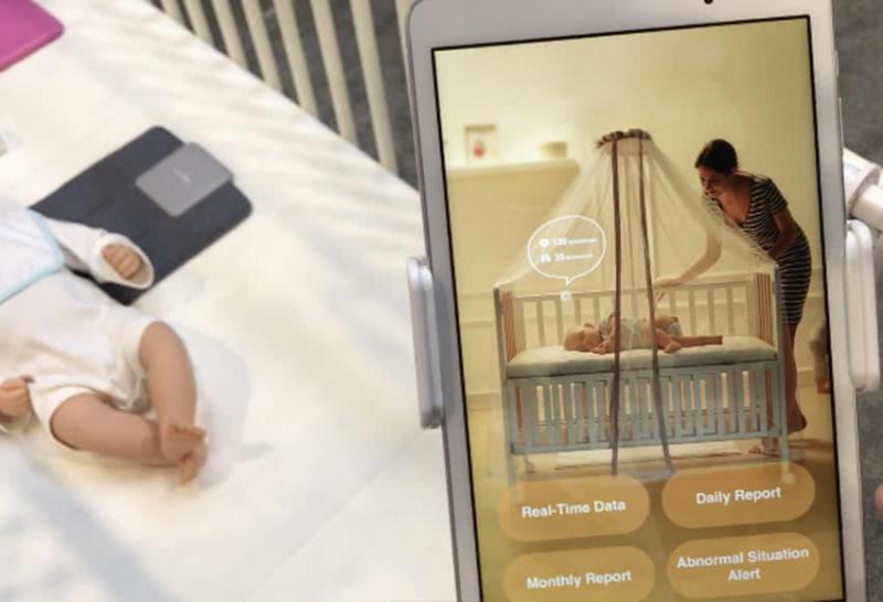 一个名为SleepAce的婴儿健康品牌在本次CES上展出了最新的感应垫系统。将一块小型的长方形感应垫放在婴儿身下,与相应的APP连接,就能实现24小时对婴儿呼吸、心率等身体状况的监控。此外,APP还能生成每日报告、每月报告的健康图表,如果感应垫检测到数据异样,APP内会进行婴儿健康警报。现场负责人表示,这款产品已经在许多月子中心投入使用并得到较好反馈,但暂时没有进入零售阶段。
