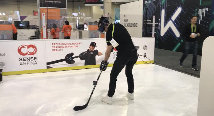 健身也不仅仅是健身。有些具有跨界思维的厂家正在思考将游戏、科技与健康三者结合。一家名为Sense Arena的公司将冰球与VR(虚拟现实)相结合,通过佩戴头显模拟冰球运动,并达到健身的效果,玩家仍然需要手握球杆,以及一块小型的冰球场地。