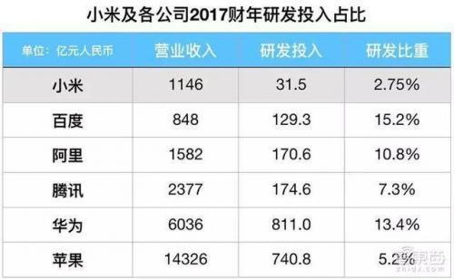 通过各个公司在2017年的研发投入对比,我们可以看到,小米2017年的研发投入为31.5亿元,只占总营收的2.75%,与榜单上其他科技企业的差距巨大。