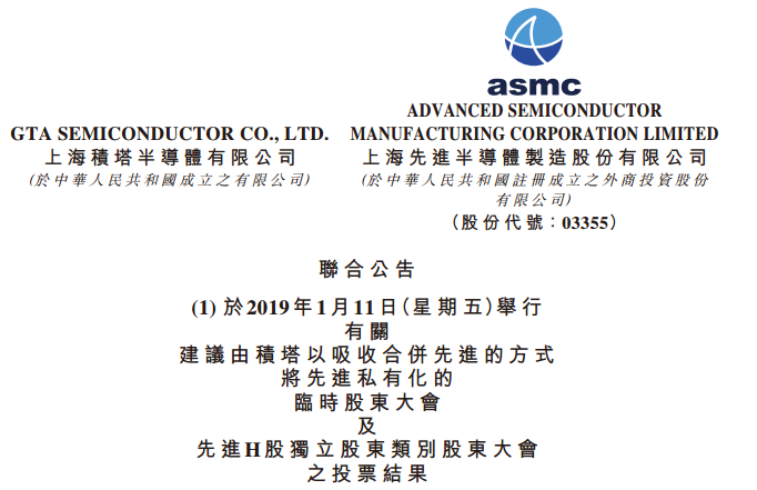 1月11日,先进半导体发布了联合公告,公司于2019年1月11日举行有关建议由积塔以吸收合并先进的方式将先进私有化的临时股东大会及先进H股独立股东类别股东大会之投票结果;建议自愿撤回先进H股之上市地位及最后交易日;建议积塔以吸收合并方式合并先进及恢复股份买卖。