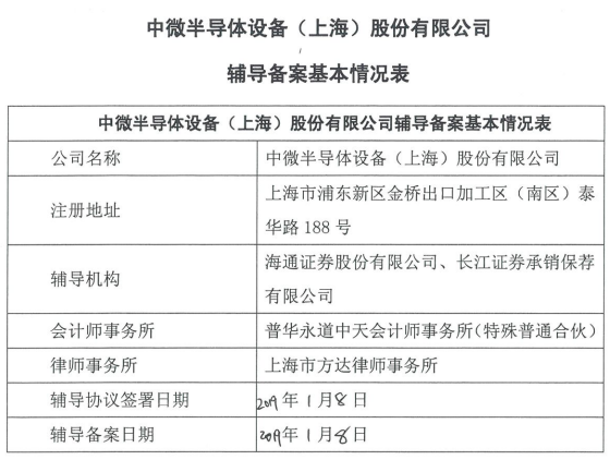 1月11日,中国证监会上海监管局发布中微半导体辅导备案基本情况表,显示中微半导体已于2019年1月8日与海通证券、长江证券签署辅导协议并进行辅导备案。