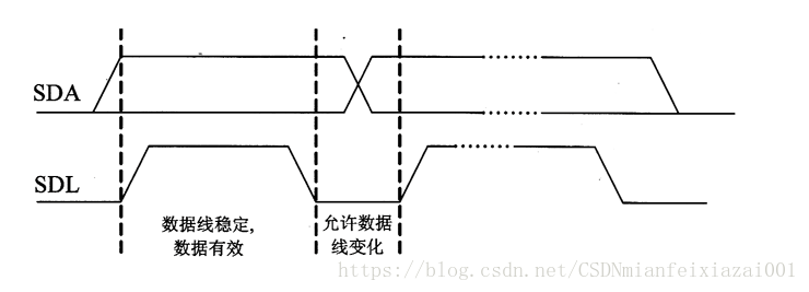 IIC数据位传输是一位一位传输的,每传输一个bit位,耗时SCL的一个时钟周期,在这个时钟周期内,低电平期间,向引脚发送数据,高电平期间,保持稳定不变,具体时序如下: