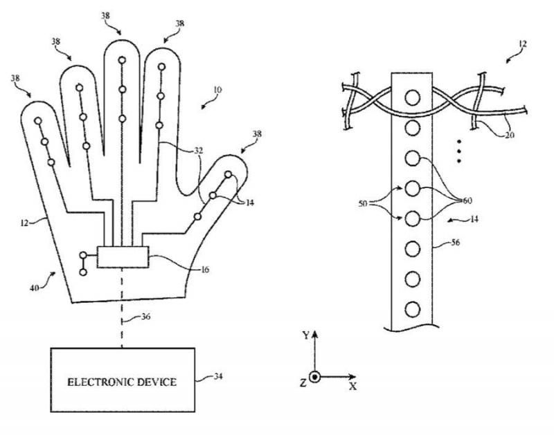 苹果官方称,这一种基于织物的产品,比如一种织物手套,可能包括力传感电路。所述力传感电路可包括由电极在可压缩衬底(如弹性体聚合物衬底)上形成的力传感器元件。该织物可包括包括导电线在内的相互缠绕的材料线。