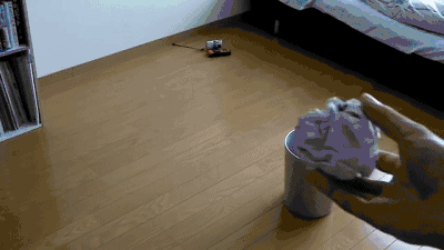 试试看效果怎么样~ 小哥坐在椅子上,上半身保持不动,然后把纸团往后随手一扔,自动垃圾桶很精准地判断了纸团地落点,然后滑动过去接住纸团。