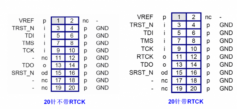 由于JTAG经常使用排线连接,为了增强抗干扰能力,在每条信号线间加上地线就出现了这种20针的接口。但事实上,RTCK、USER IN、USER OUT一般都不使用,于是还有一种14针的接口。对于实际开发应用来说,由于实验室电源稳定,电磁环境较好,干扰不大。