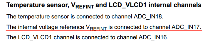 于是回到最初的方案,使用IO口采样电压的模拟值,打开PA1对应的ADC通道,在正常获得了正常AD转换值后怎么办呢,数据手册是个好东西! 它又一次给了我们答案......让我们上图