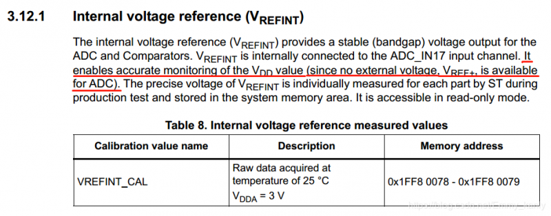 对ADC工作比较重要的电压一般就两个,VDDA供电让ADC运行,VREF+提供ADC转换的参考电压值。经查阅该型号的数据手册,直接通过供电给VREF+的方式定ADC的基准电压是不可行的,于是下图中也标注了芯片生产制造时已经根据一定环境测试出了一个精准的电压值,此值存储在内存地址如图所示处,这个VREFINT_CAL下面会用到。