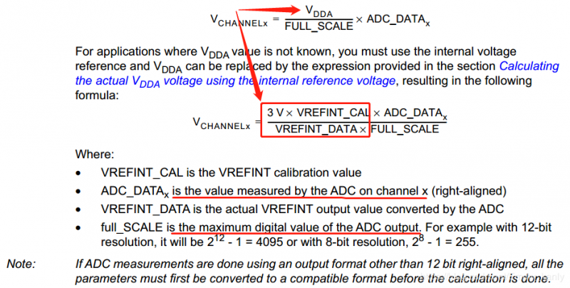 好了,大体意思就是公式里的VDDA如果不知道,那可以用内部参考电压计算的值代替VDDA计算通道上获取的电压值,剩下的两个参数为实际从通道获得的AD值ADC_DATAx和用户自己配置的ADC最大分辨率输出值full_SCALE,这两个值都很好得知,在此不做阐述(如有需要可以评论处提问),这样IO口处的电量值就被计算出误差在0.0x,已达到需要的标准。