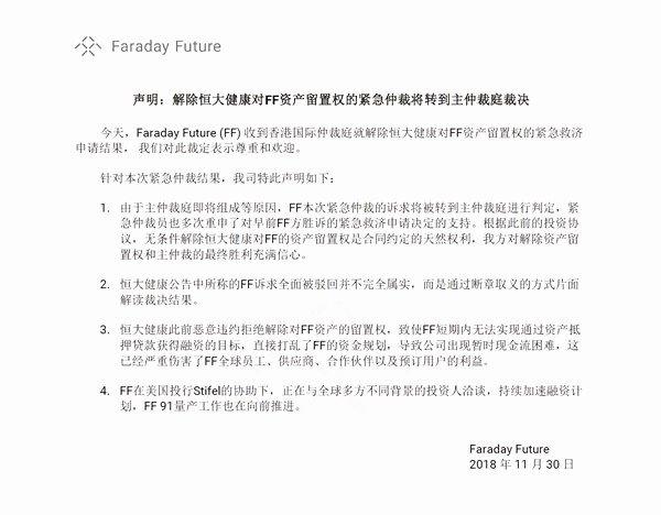 此后,双方多次“隔空交战”。10月25日晚,恒大健康发布公告称,时颖收到紧急仲裁的结果,仲裁员驳回Smart King彻底剥夺时颖融资同意权的申请。不过,FF却给出了相反的仲裁结果,表示“仲裁员裁决恒大不能再阻止FF从其他融资渠道获取资金。”