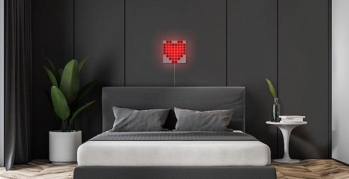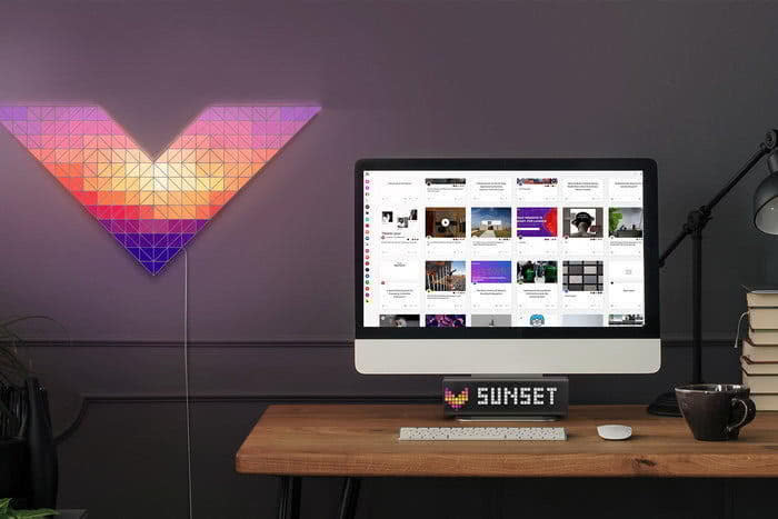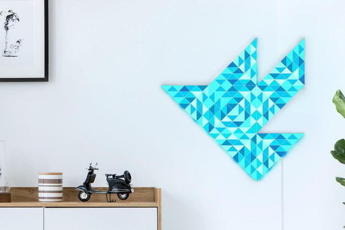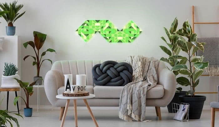 LaMetric Sky 是一系列不同色块的三角形 LED 灯板组成的灯具,每组都包含32个单独的三角形发光体。它可以轻松地用双面胶带粘在墙上,也可以根据喜好自行调整形状组合。开启后,还可以通过 Alexa,Siri或Google智能助理创建自定义场景并使用语音命令操控。