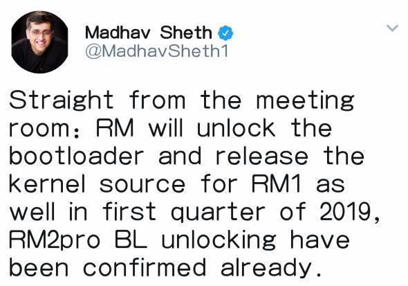 集微网消息,在去年晚些时候,Realme CEO Madhav Sheth发推特承诺,官方允许用户解锁Boot loader(简称BL),并将于2019年第一季度开放Realme1的内核源代码,Realme2 Pro的解锁BL工作也已经确认了。