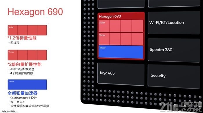 DSP方面,骁龙855这次升级到了Hexagon 690,包括四线程标量内核、四个向量扩展内核以及张量加速器等等。