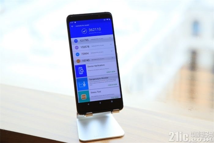 跑分方面,现场实测这台骁龙855开发样机在安兔兔v7版本下总成绩为362110,其中CPU成绩为121795、GPU成绩为155578、UX成绩为73994、MEM成绩则是10743。
