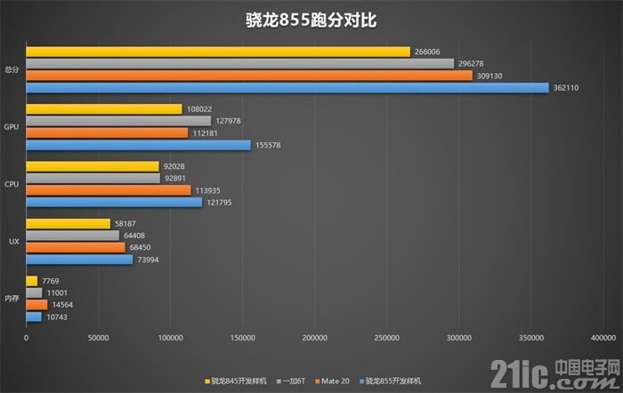 为了能够让大家更直观的了解到骁龙855的性能表现,安兔兔选取了一加6T(代表主流骁龙845手机)、华为Mate 20(代表麒麟980)以及去年同期骁龙845开发样机的成绩来进行对比。其中,一加6T和Mate 20的成绩均取自安兔兔性能排行榜2018年12月份的平均成绩,而骁龙845开发样机的成绩则是去年同期笔者实测而来的。