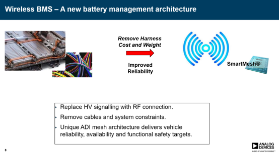 如何对锂电池动力系统的监测管理信息进行高效连接也非常关键。Vincent 指出ADI全新的无线电池管理技术能将这些信号采用射频的无线连接方法,借助 SmartMesh 无线网格网络产品在BMS上进行整合。ADI曾将高精度电池组监视器及无线网格网络在BMW i3车型上进行了整合,推出了取代电池组和电池管理系统之间有线连接的全球首个无线BMS概念车,解决了电动汽车中连接线长期存在的可靠性问题,并简化了BMS设计和制造。