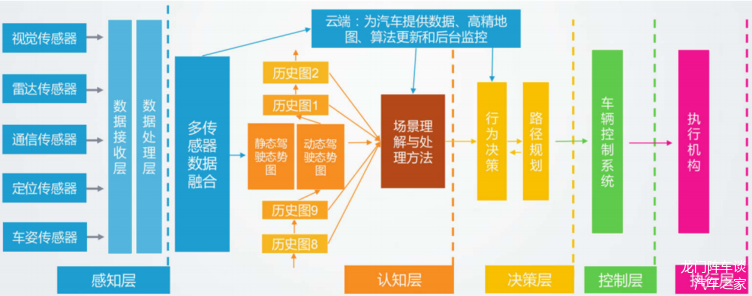 那么,智能网联是如何实现的?根据自动驾驶的拟人化实现思路,途径可以分为感知——认知——决策——控制——执行五部分,其中传感器发挥着类似于人体感官的感知作用,认知阶段则是依据感知信息完成处理融合的过程,形成全局整体的理解,据此自动驾驶系统通过算法得出决策结果,传递给控制系统生成执行指令,完成驾驶动作。