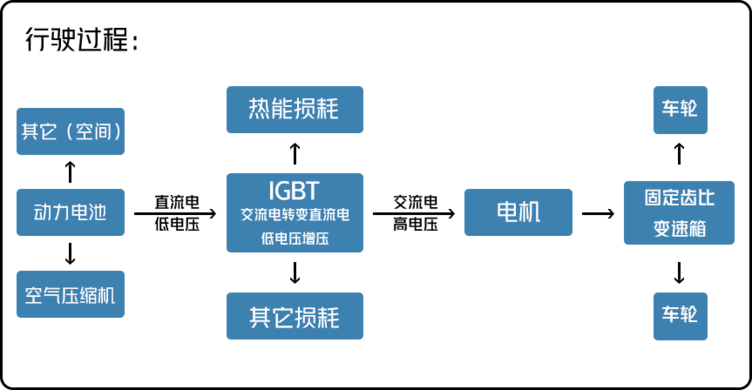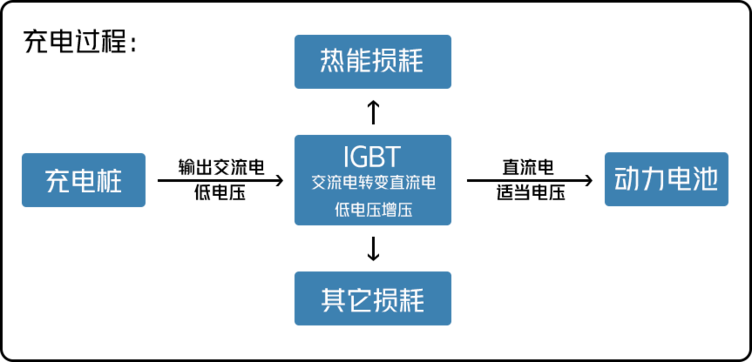 外界充电的时候,输出的是交流电,需要通过IGBT转变成直流电,同时要把220V电压转换成适当的电压值才能给电池组充电,在此过程中可能会伴随着能量的损耗。