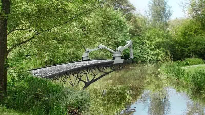 荷兰设计师JorisLaarman曾运用设计好的3D打印建筑机器人在阿姆斯特丹运河的边缘建造了一座精美的钢铁大桥。这是实实在在可以正常使用的大桥,这位设计师希望阿姆斯特丹人民可以在其上面行走并使用几十年的时间。