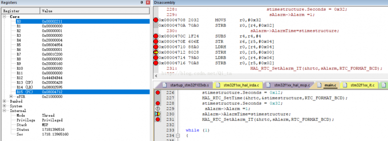 调用sAlarm->AlarmTime=(RTC_TimeTypeDef)stimestructure和 HAL_RTC_SetAlarm_IT(&hrtc,sAlarm,RTC_FORMAT_BCD);,就会进入HardFault_Handler。调试发现错误出现在LDRB r0这条汇编指令上。