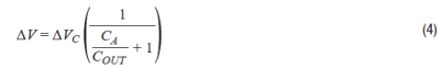 切换后,输入电容CA将并联到输出电容COUT。然而,CA和COUT最初可能处于不同的电位,这将导致CA和COUT之间发生电荷共享。对于超高带宽多路复用器,电荷共享几乎立即发生,导致多路复用器输入端出现高频毛刺。此毛刺的幅度ΔV由下式给出: