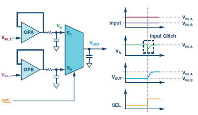 当多路复用器从一路输入切换到另一路输入时,输出仍然有前一输入通道的记忆,其表现形式为多路复用器的输出负载电容和寄生漏极电容中存储的电荷。这对于高容性负载(例如ADC驱动器和ADC本身)更为明显,因为这些存储的电荷没有低阻抗路径可以走。甚至可以说这些电荷被困住了,原因是输出为容性,并且现代多路复用器采用先开后合(BBM)机制,故多路复用器具有高阻抗。只有切换到下一路输入,这些电荷才能被释放电。