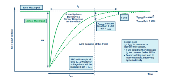 另一方面,转换器以周期tACQ采样(也称为采集时间)。在tACQ过去后的ADC转换阶段,转换器将量化任何可用的采样数据。如果VERROR衰减速度过慢,导致其未稳定在某一值(1 LSB到几个LSB)以内,就会产生问题。这将导致当前样本被前一模拟输入破坏,引起ADC通道之间的串扰。考虑到输入建立时间,必须确保输入建立时间小于转换器采集时间,以使误差最小。而且,进一步减小tS还为使用更快转换器以提高系统总吞吐量和密度提供了机会。
