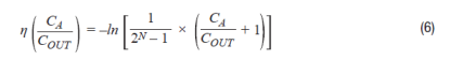 η是缓冲器电容(CA)与输出电容(COUT)之比的函数。如果1 LSB等于满量程输入范围除以2的N-1次方(N为位数),并且最差情况下ΔVC等于满量程输入范围,则该表达式可以进一步简化。