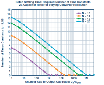 可以看出,CA/COUT值越高,则建立时间越短;电容比非常高时,建立时间甚至接近0。COUT实质上是多路复用器的漏极电容和后续各级的输入电容,因此只有CA保持比较灵活的自由度。对于10位分辨率,要使建立时间为0,CA须比COUT大至少1000倍;对于20位系统,至少要比COUT大1,000,000倍!举例来说,对于10位和20位系统,为使建立时间为0,100 pF的典型负载分别需要100 nF和100μF的缓冲器电容。