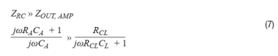 典型缓冲架构由缓冲(G = 1)配置的精密放大器与缓冲器网络级联组成。在频域中分析,此子系统的输出取决于缓冲器输入阻抗与缓冲器输入阻抗和放大器闭环输出阻抗之和的比率。检查可知,为避免负载效应,缓冲器输入阻抗应该大于放大器闭环阻抗,如公式7所示。
