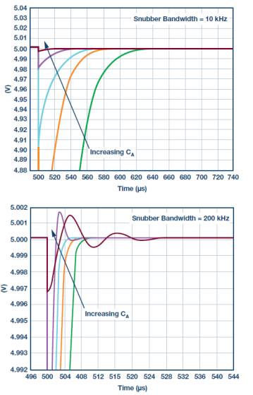 图7显示,对于具有足够带宽的精密放大器(例如-3 dB闭环带宽约为970 kHz的ADA4096-2),结果与目前进行的分析一致,但少数波形除外。对于10 kHz的缓冲器带宽,最大CA产生最快的输入建立时间。而对于200 kHz的缓冲器带宽,增大CA仍然会加快建立时间,直至发生负载效应。从结果中看到的欠阻尼响应具有极小的毛刺幅度,但建立时间比较小CA所产生的响应要长,尽管后者的毛刺幅度较高。这凸显了仔细研究缓冲器如何加载放大器的重要性,在为系统选择器件时务必考虑这一点。
