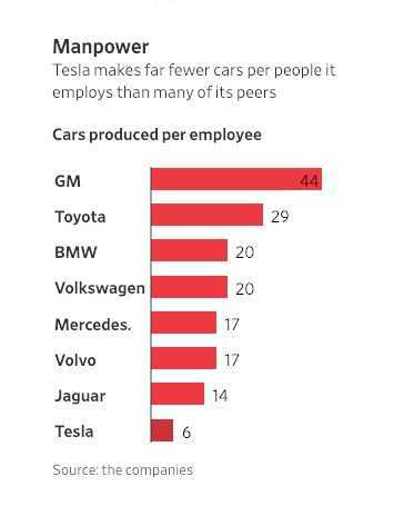 特斯拉拥有4.5万名员工,在去年生产了26万辆汽车,相当于每位员工生产大约5辆汽车。诚然,特斯拉承担了更多自产任务(例如生产座椅),并生产太阳能电池板,但是其他豪华车制造商每位员工生产的汽车数量是特斯拉的三至四倍。特斯拉的裁员有助于缩小这一差距,但难以弥合。