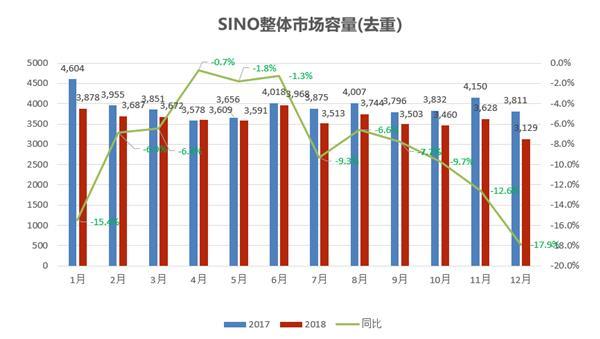 赛诺最新数据报告显示,2018全年,中国智能手机市场整体销量仍然处于下滑通道。从1月到12月,单月市场出货量均不及2017年同期。尤其是12月,市场容量3129万台,同比下降高达17.9%。