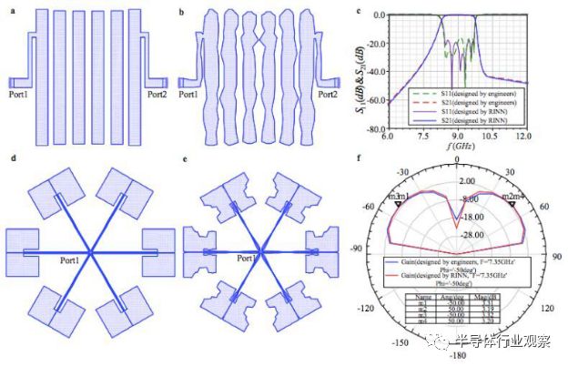 最近,来自清华大学等单位的研究团队发表了使用基于强化学习人工智能做自动化毫米波电路(论文中的例子是滤波器)的设计。根据论文结果,使用人工智能算法实现的滤波器设计能达到和真人工程师相近的指标,而有趣的是人工智能算法得到的滤波器的形状则较为不规则(下图中的a和d是真人工程师的设计,b和e是人工智能算法的设计)。