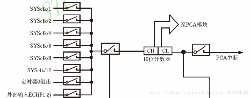 16位PCA定时器/计数器相当于定时器0/1。每经过一个时钟周期会自动加1,时钟周期来源与下图几部分: