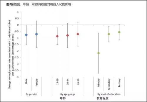 在2010年至2016年间,只有13%的就业率下降归因于机器人普及化。换句话说,大部分就业率总体下降的原因用机器人抢了人类工作这个因素是解释不了的。在机器人普及化影响方面,男性和女性之间或年轻和老年工人之间没有统计学上的显着差异。所以不能断言机器人抢了男人工作,女人工作,或者抢了老年人、工作经验不足的年轻人的工作。然而,也许并不奇怪,就目前暴露出来的机器人对人的影响中,对教育水平相对较低的人来说影响最大(图3)。但是,随着技术的发展,情况很可能会发生变化。