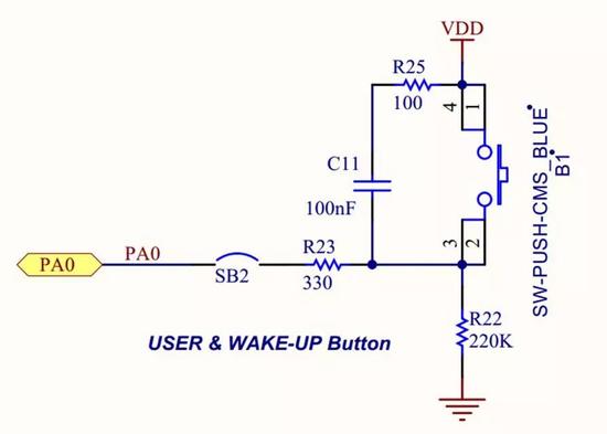 之所以改用TIM2是因为TIM5的CH1(PA0)还是按键输入引脚。本来想来这应当也没什么,按键不按下不就是开路嘛。但是后来发现官方开发板上还有一个RC滤波……