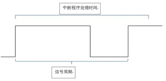 这样的改进应当能够将最高采样频率增加到2M.但是频率的进一步提高仍然不可能。因为这时的主要矛盾是中断函数时间过长,导致CPU还在处理中断的时候这一次周期就结束了,使得最终测量到的频率为真实频率的整数倍左右。示意图如下: