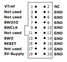 (1)按SW方式来调试,实际需要接1,7,9,15,20脚,某些资料上说的需要6个脚(第13脚SWO也需要连上)是不对的,SWO不需要连接。