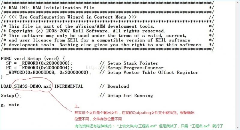 (3)修改RAM.ini文件:将红圈处改为“工程名.axf”就行了。如果没有找到该文件不要怕,自己在文本编辑器里面写一个,就几行保存为.ini格式就行了。
