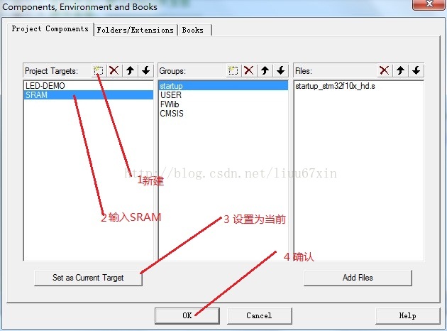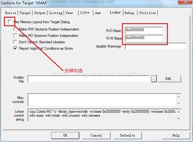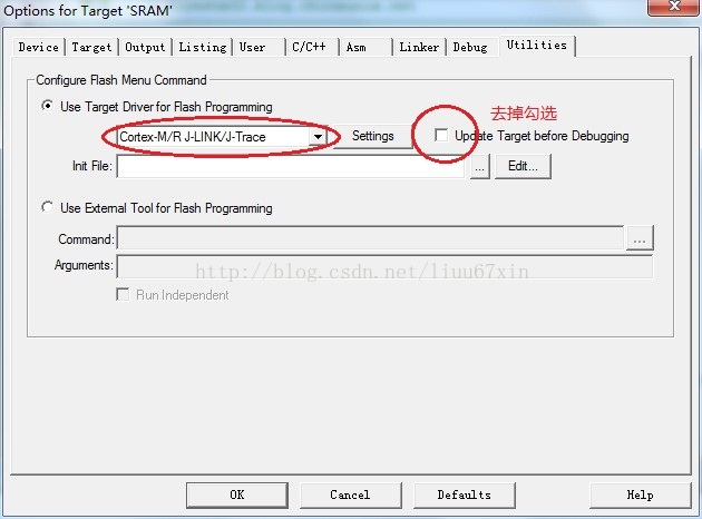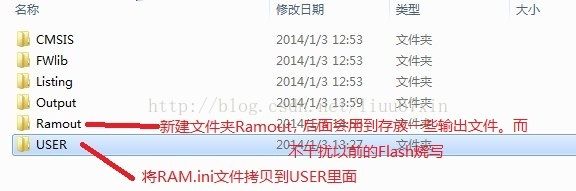 (1)将Keil安装目录下:D:\Keil\ARM\Boards\Keil\MCBSTM32\STLIB_Blinky的RAM.ini文件拷贝到需要调试的工程目录下。